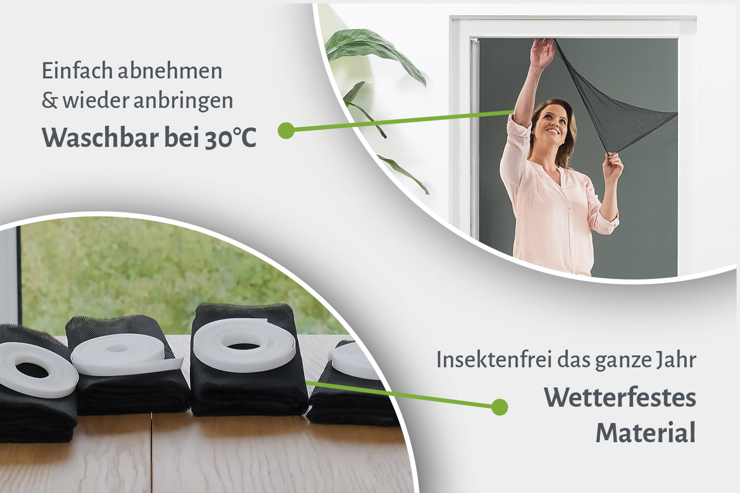 Sag lästigen Insekten im Handumdrehen den Kampf an! Dieses Fliegengitter lässt sich ganz ohne Bohren oder Schrauben anbringen – ideal auch für Mietwohnungen. Die Montage ist kinderleicht, und bei Bedarf kann das Netz ebenso schnell wieder entfernt werden. Kleberückstände? Kein Problem – sie lassen sich einfach mit handelsüblichen Reinigern beseitigen. Das strapazierfähige Polyestergewebe ist wetterbeständig und bei 30 °C waschbar, sodass du lange Freude daran hast. Das Gitter ist für nahezu alle gängigen Fensterarten bis zu einer Größe von 130 × 150 cm geeignet. Einfach das Netz samt Klettband auf Maß zuschneiden, im Rahmen fixieren – fertig!