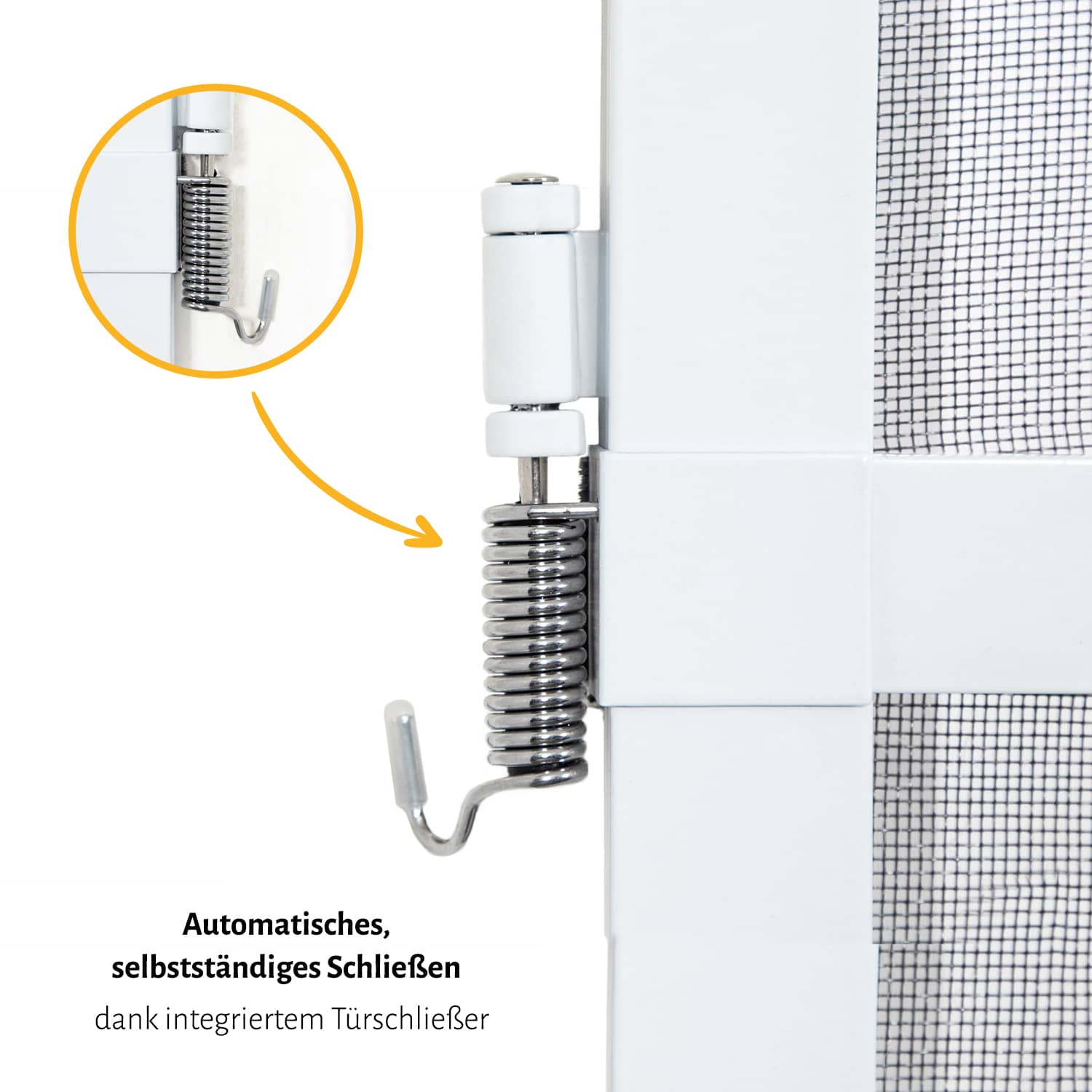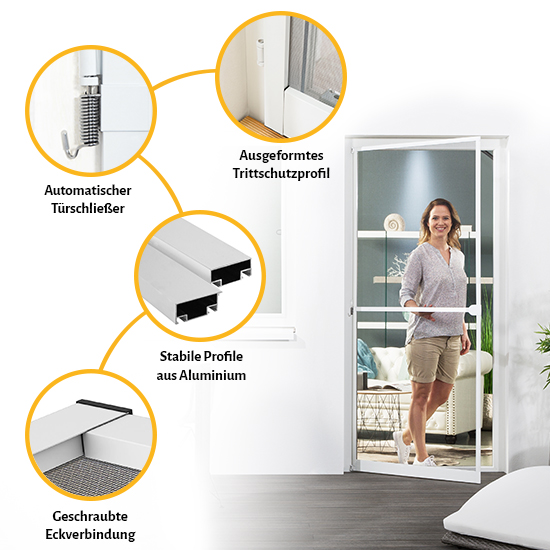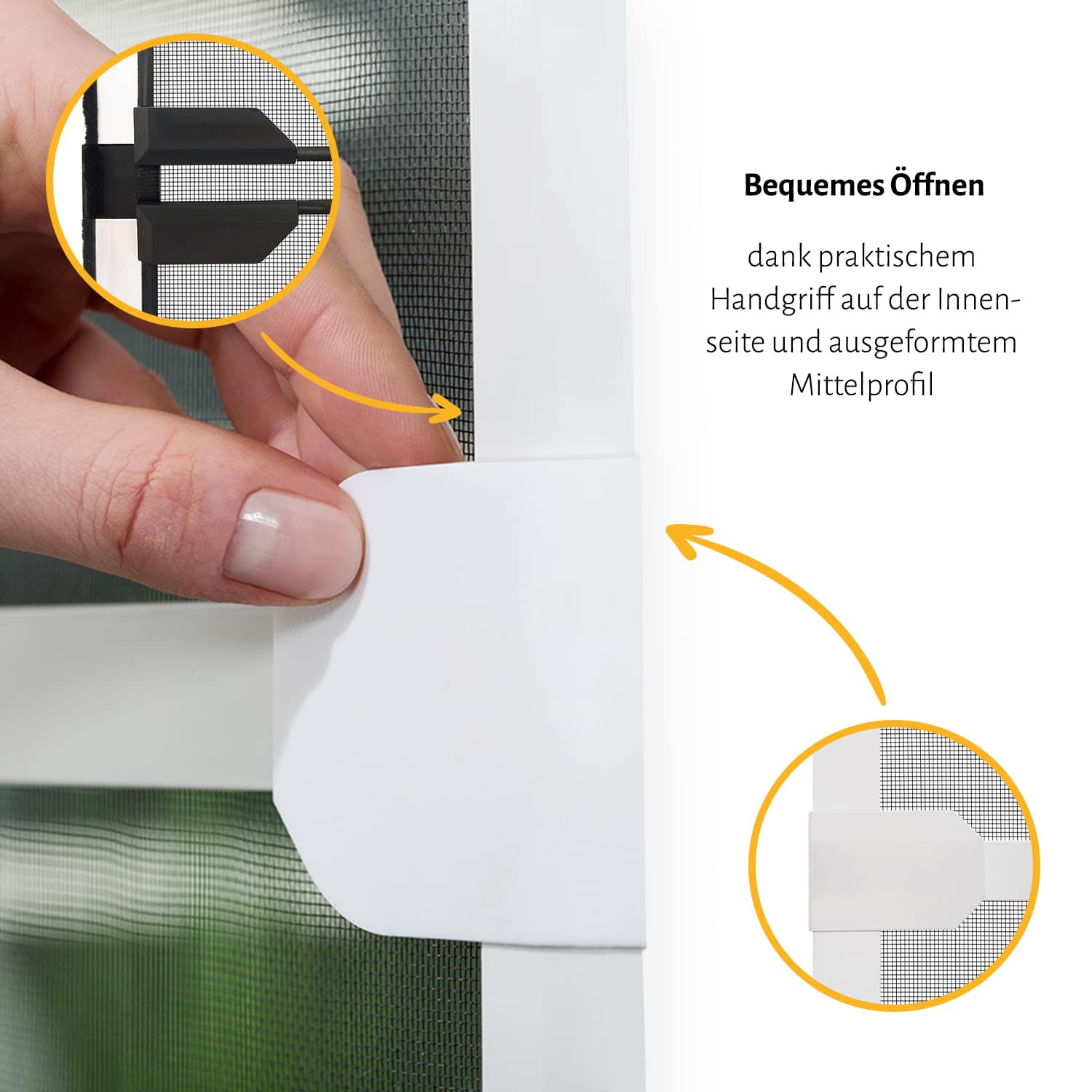 Wie der Name schon sagt, ist der „MASTER PRO“ mit seiner hochwertigen und stabilen Beschaffenheit, der absolute Profi unter den Insektenschutztüren. Dank der eingesetzten Bürstendichtung rundherum bietet dir dieser Bausatz einen umfangreichen Schutz und ist durch den hochwertigen Aluminium-Rahmen wetterfest und besonders langlebig. Das Besondere an dieser Insektenschutztür ist die neuartige Schraub-/ Eckverbindung. Diese sorgt für extra Stabilität und macht den Bausatz völlig verwindungssteif. Aufgrund der schmalen Profile genügt schon ein Mindestabstand von 18 mm zwischen Türrahmen und Verdunkelungsrollo, um den Insektenschutzrahmen optimal anbringen zu können. Die Haltemagnete führst du direkt in das Bürstenprofil, somit sind sie nicht mehr sichtbar.