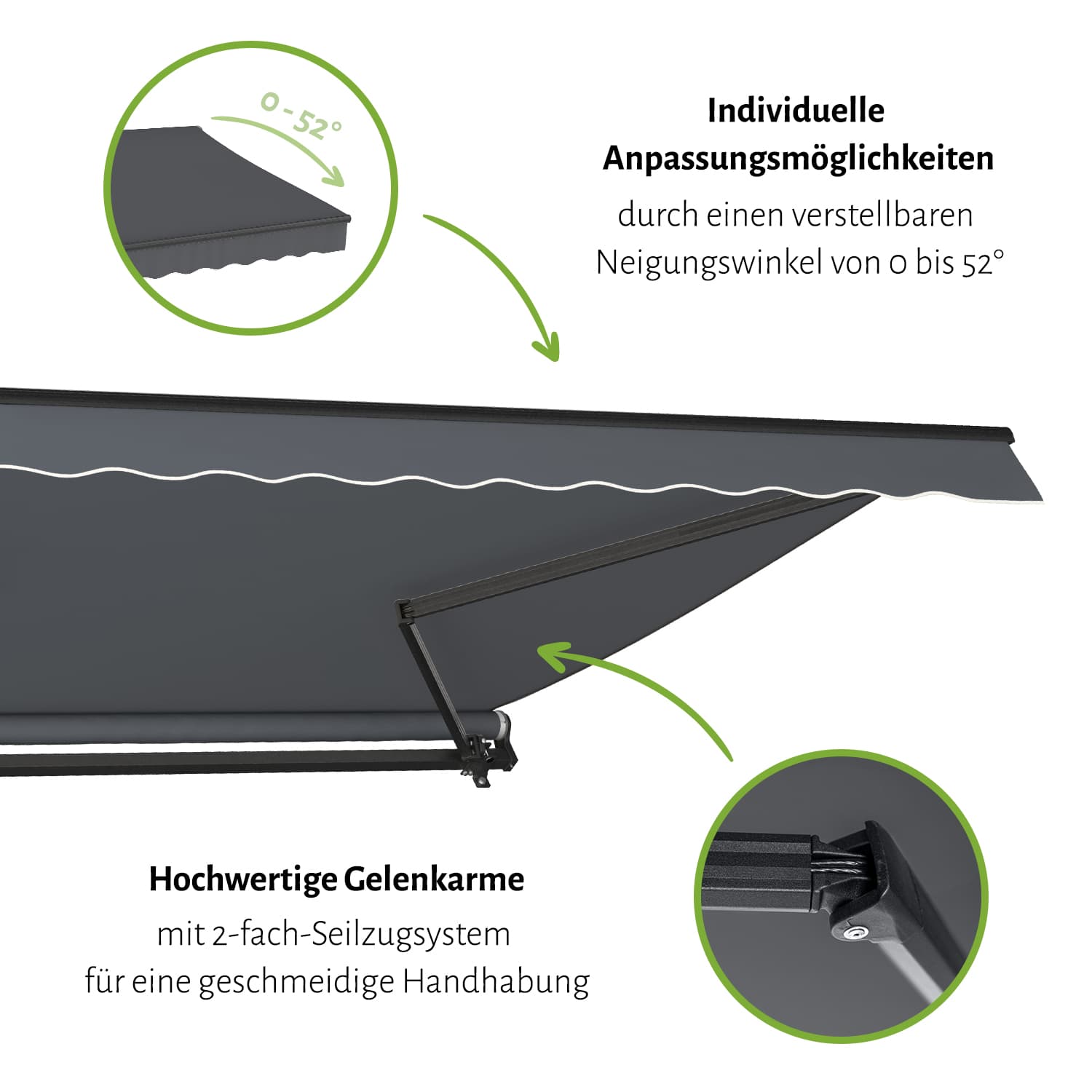 Die Gelenkarmmarkise, die dir in zahlreichen Farben und Größen zur Verfügung steht, überzeugt durch die einfache Bedienung per Handkurbel an der linken Seite und bietet zuverlässigen Schutz vor Sonne und schlechten Wetterbedingungen. Der Neigungswinkel kann problemlos verstellt werden, sodass du jederzeit im Schatten sitzen kannst. Dank der eingebauten Wasserwaage im Ausfallprofil ist das genaue Einstellen der Arme kinderleicht. Das pulverbeschichtete Alu-Gestell und der wetterfeste Polyesterstoff ermöglichen eine lange Lebensdauer deiner Markise.