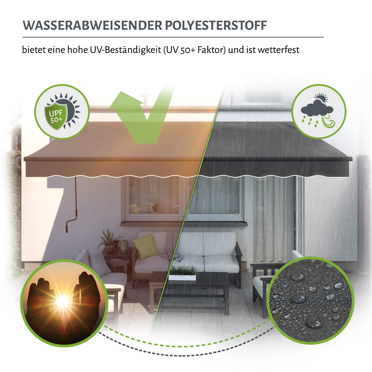 zum ProduktHinweis Mietwohnung / Miethaus: Das Anbringen einer Markise ist eine bauliche und optische Veränderung einer Wohnanlage. Daher muss die Montage oder möglicherweise auch die Markisenfarbe mit Vermieter oder Eigentümergemeinschaft geklärt werden.