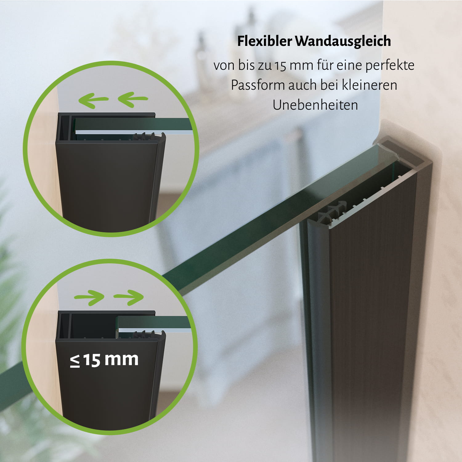 Unsere Glasduschwände sind dank der speziellen Nanobeschichtung besonders bequem in der Pflege. Die Beschichtung sorgt dafür, dass Wasser und Schmutz einfach abperlen und Kalkablagerungen minimiert werden. Das Ergebnis: weniger Reinigungsaufwand und ein stets gepflegtes Erscheinungsbild deiner Dusche.