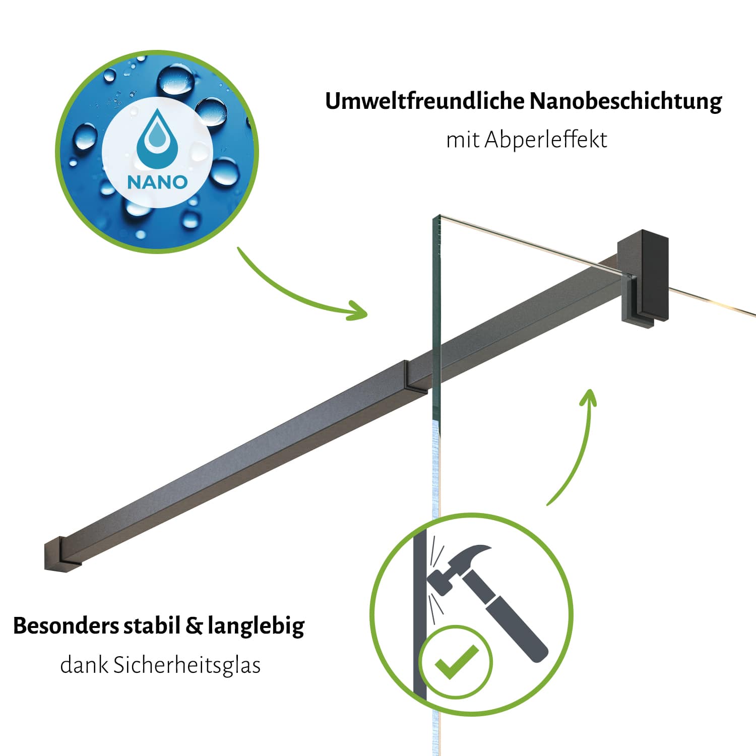 Ein besonderes Highlight unsere Duschwände aus Glas ist die Nanobeschichtung. Diese verlängert nicht nur die Lebensdauer des Glases, sondern trägt auch dazu bei, dass dein Badezimmer immer strahlend sauber und hygienisch bleibt.