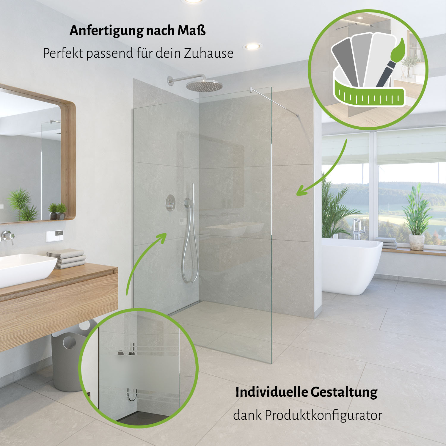 Unsere Glasduschwand nach Maß ist die ideale Wahl für die individuelle Gestaltung deines Badezimmers. Dank der flexiblen Konfiguration nach Wunschmaß ist die Walk-In-Dusche für jede Einbausituationen geeignet. Die Duschwände aus Einscheibensicherheitsglas (ESG) können mühelos montiert werden und sind dank ihrer Eigenschaften besonders robust und langlebig.
