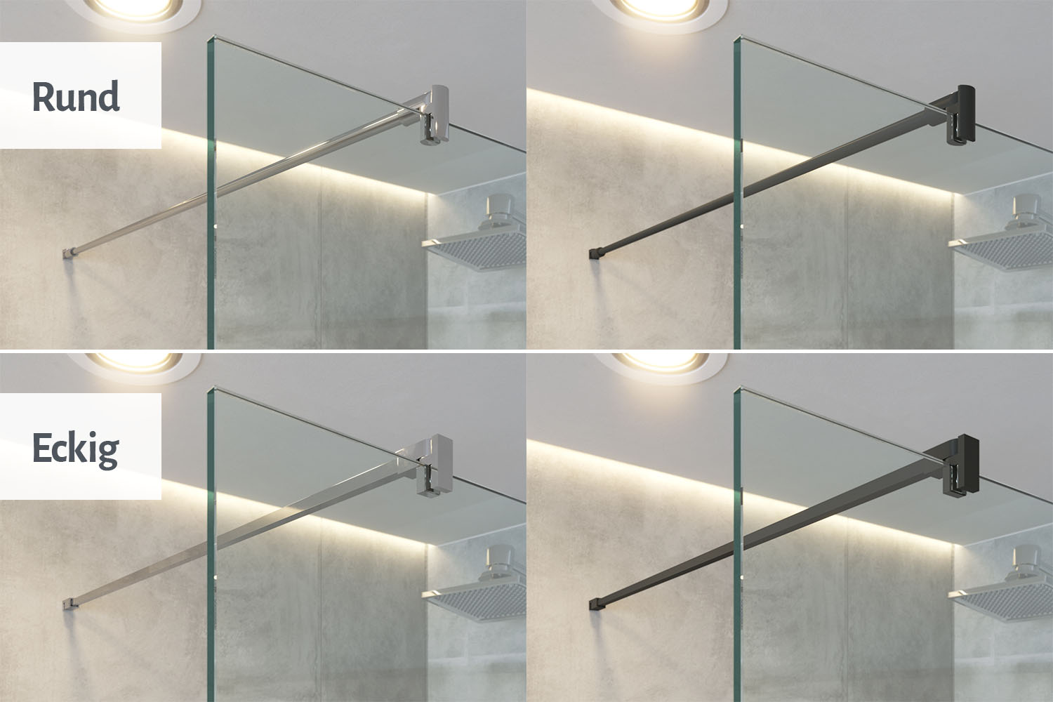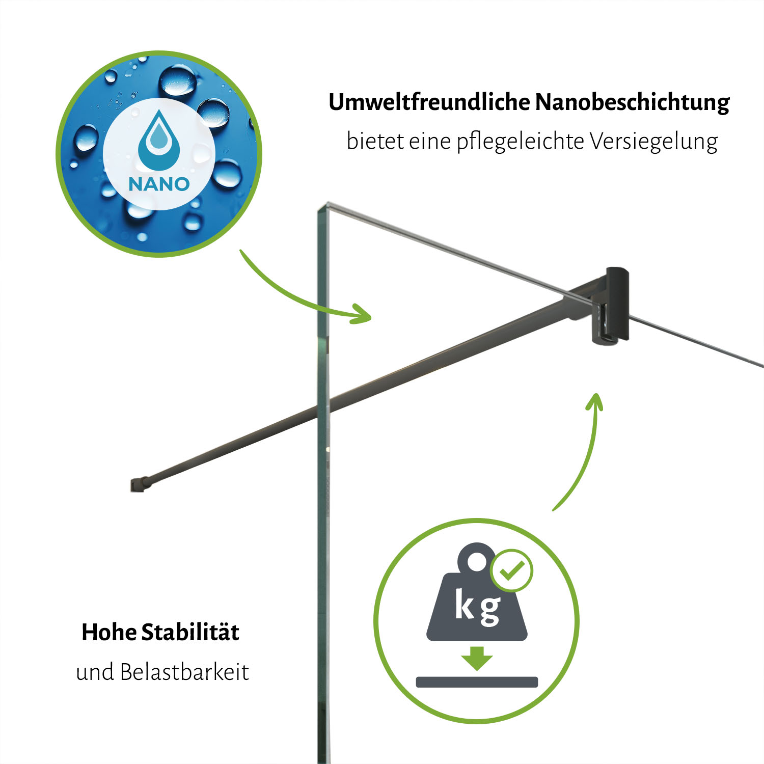 Unsere Glas-Duschtrennwände entsprechen höchsten Sicherheitsstandards und sind aus 8-mm bzw. 10-mm Einscheibensicherheitsglas (ESG) gefertigt. Zusätzlich kannst du eine Nano-Glasversiegelung wählen - müheloses Reinigen und ein langanhaltender Glanz ist garantiert!