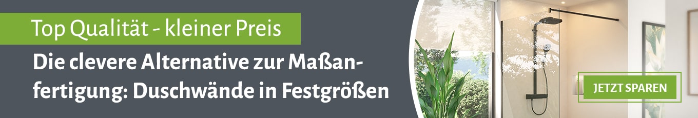 *Die Glasversicherung deckt Spontanbrüche des Einscheibensicherheitsglases ESG der Glasduschwand ab. Ein Ersatz der Glasduschwand erfolgt nur bei gebuchter Glasversicherung. Die Glasversicherung gilt ab dem Moment der Warenannahme bis zur Fertigstellung des Einbaus der Glasduschwand mit gleicher Abmessung und Ausführung. Nachträgliche Änderungen der Abmessung und Ausführung können nicht über die Glasversicherung reguliert werden. Ausgeschlossen sind zudem Brüche durch externe Einwirkungen seitens des Verarbeiters oder Bauherren.