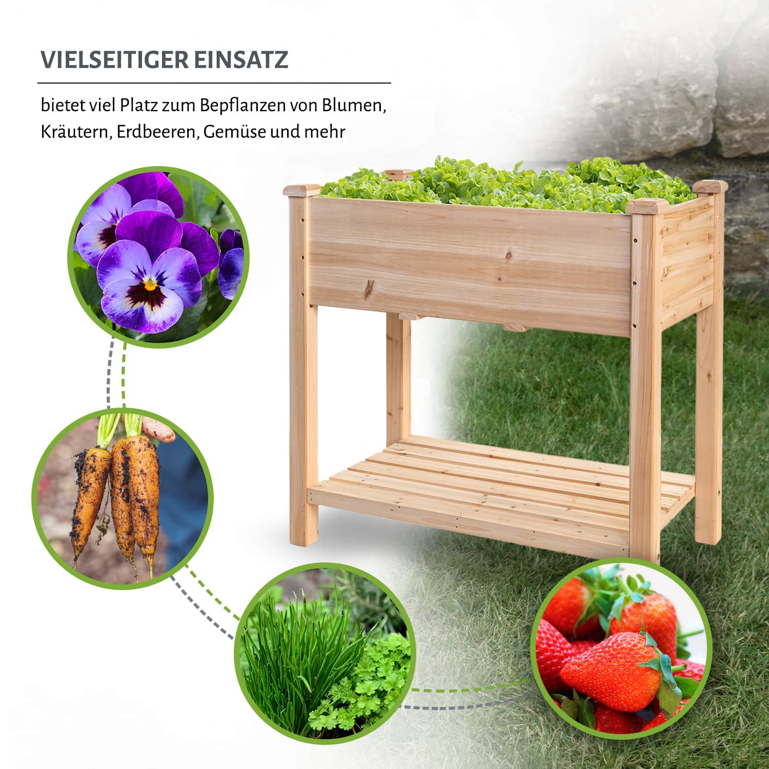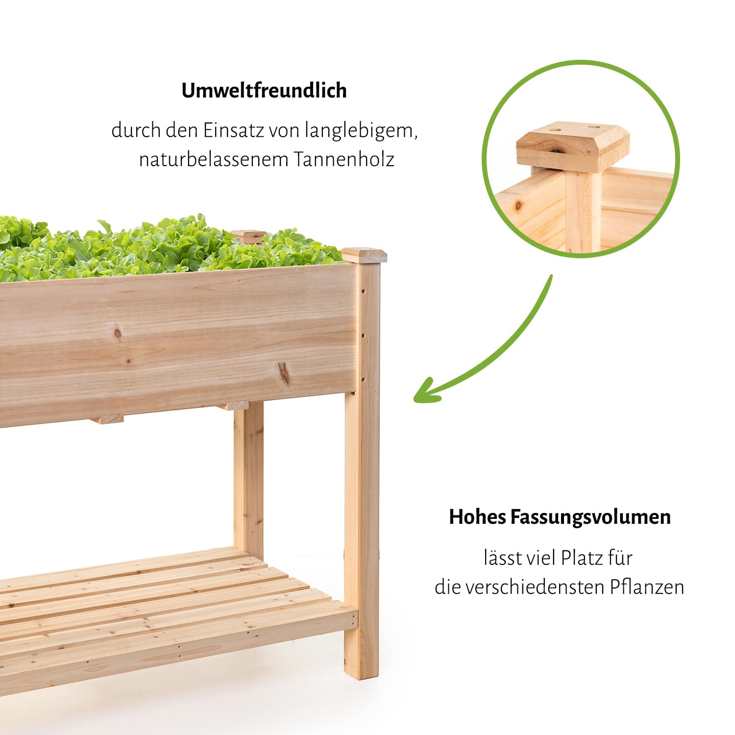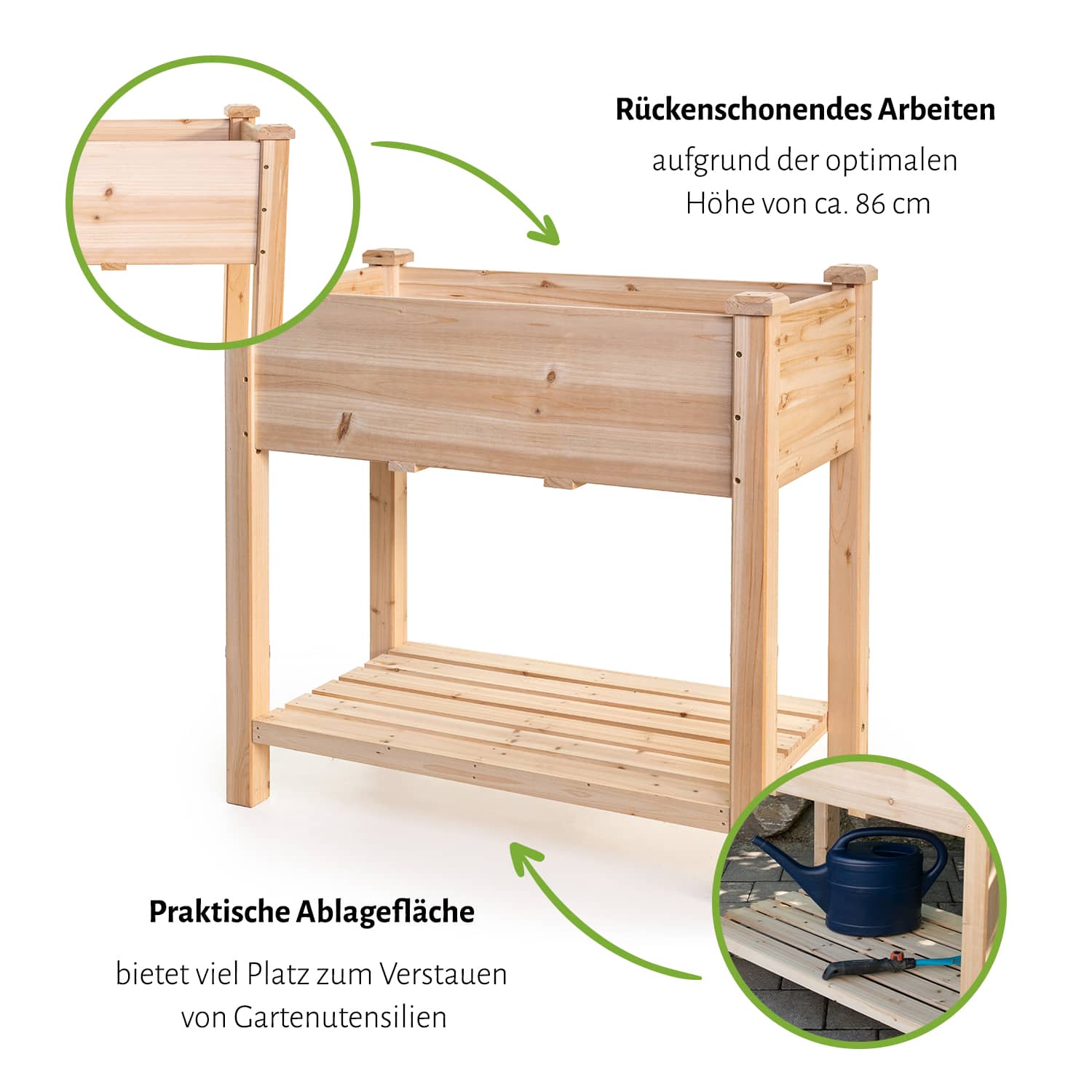 Ob Bio-Gemüse oder Zierpflanzen - mit diesem praktischen Hochbeet aus massivem Tannenholz sind dir keine Grenzen gesetzt. Aufgrund der optimalen Höhe von ca. 86 cm kannst du entspannt deine Pflanzen anbauen ohne deinen Rücken zu belasten. Das Hochbeet mit hohem Fassungsvermögen von ca. 62 Litern besitzt eine praktische Ablagefläche, auf der du Gartenwerkzeug oder Blumenerde ablegen kannst. Pflanzen sind nicht im Lieferumfang enthalten.