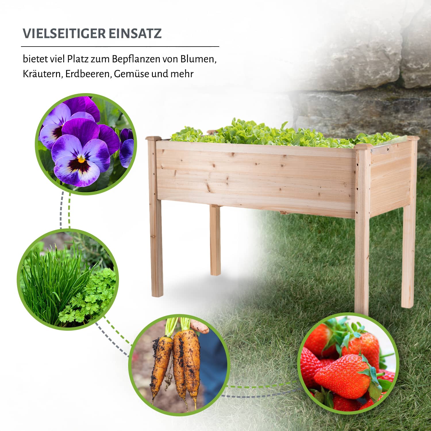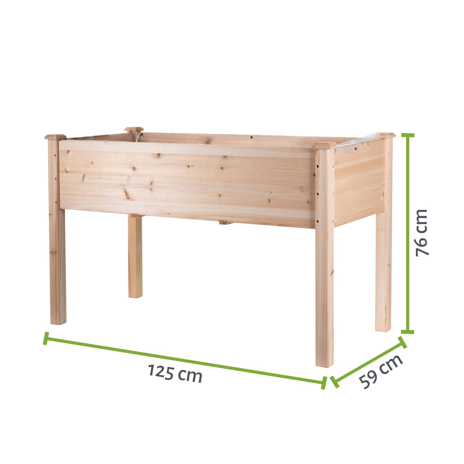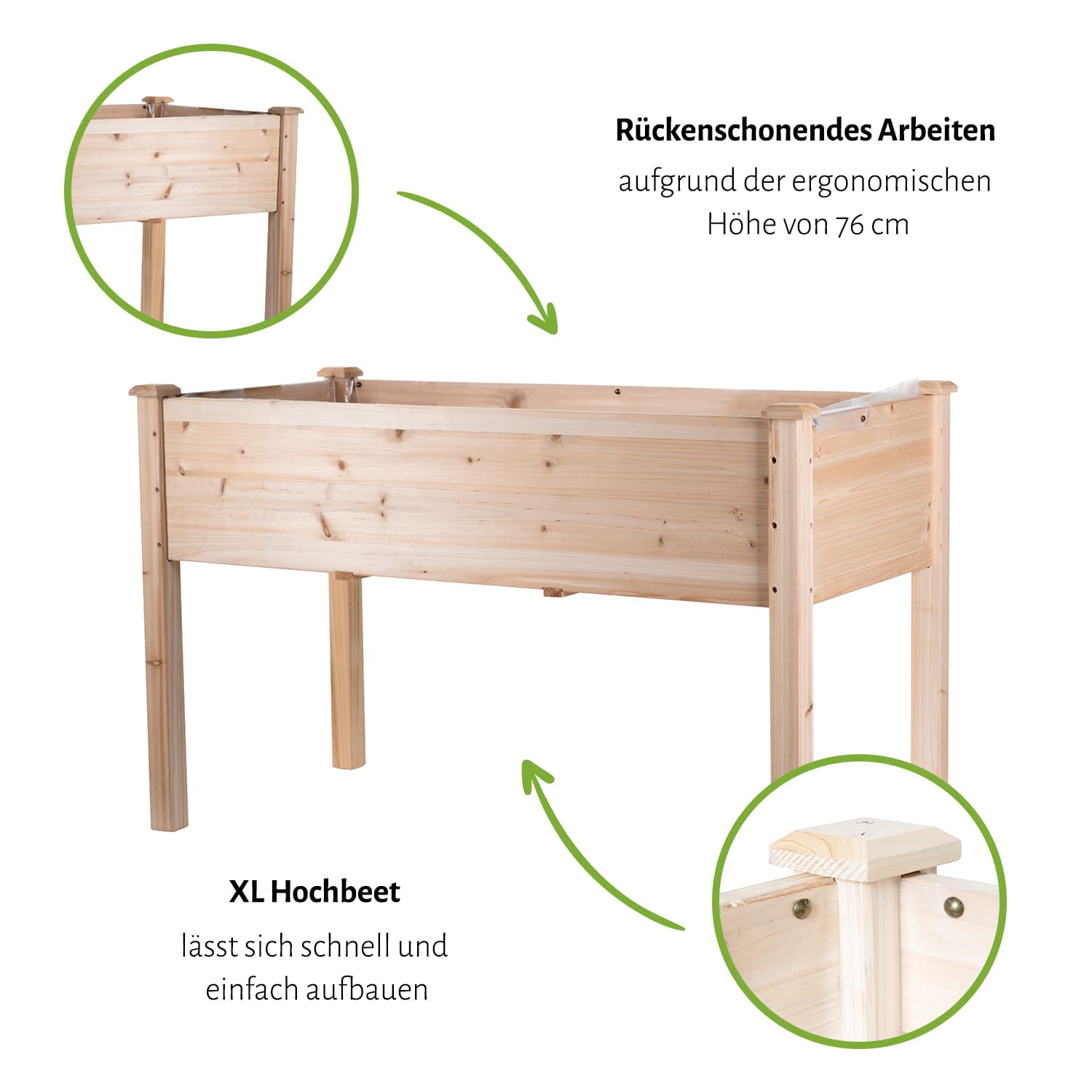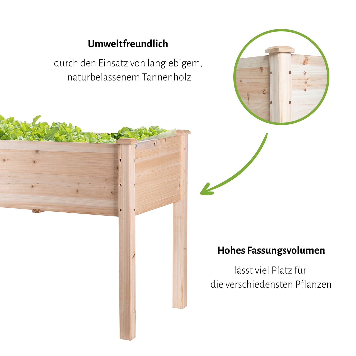 Die Hochbeete bestehen aus naturbelassenem Holz, deswegen können sich die Eigenschaften nach einiger Zeit im Außenbereich ändern.