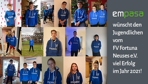 Das Jahr 2020 war für uns alle ein besonderes Jahr und hat uns vor viele Herausforderungen gestellt hat. Gerade für Kinder und Jugendliche war es nicht immer einfach, denn viele Sport- und Freizeitaktivitäten konnten plötzlich nicht mehr stattfinden. Darum war es für uns bei empasa ein Anliegen, unseren Nachwuchs mit einer Spende zu unterstützen. Es freut uns, dass der FV Fortuna Neuses e.V. seine Jahrgänge U11 bis U17 kurz vor Weihnachten 2020 mit neuen Vereinshoodies überraschen konnte. Wir wünschen dem FV Fortuna Neuses e.V. weiterhin alles Gute und viel Erfolg.