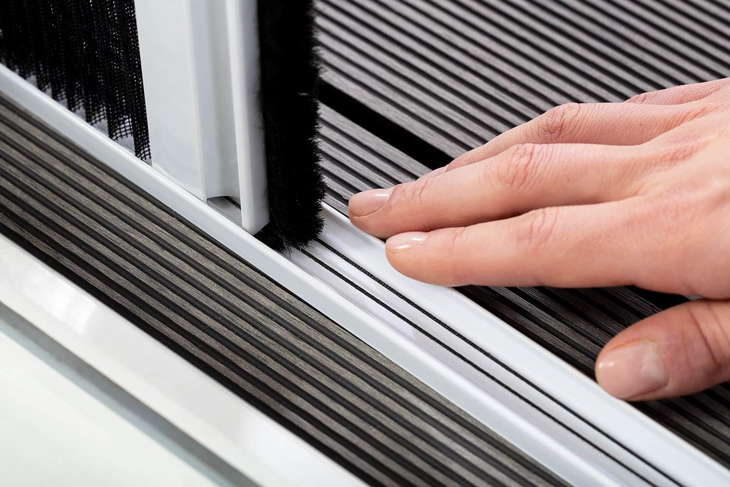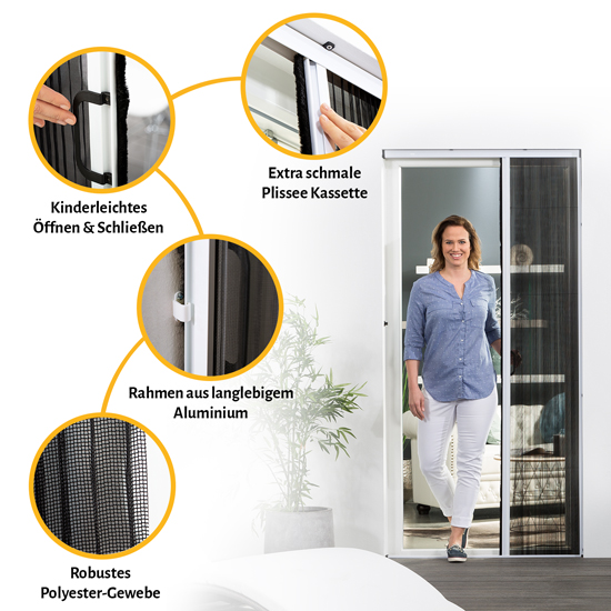 Unsere Insektenschutz Plissee Tür lässt sich dank ihrer durchdachten Konstruktion kinderleicht öffnen und schließen. Sie ist universell kürzbar und lässt sich an nahezu jedem Türrahmen verbauen. Der Bausatz besteht aus einer extra schmalen Plissee Kassette inklusive Polyestergewebe, seitlichen Führungsschienen sowie Montagematerial. Der Rahemen der Plissee Tür besteht aus langlebigen Aluminium.
