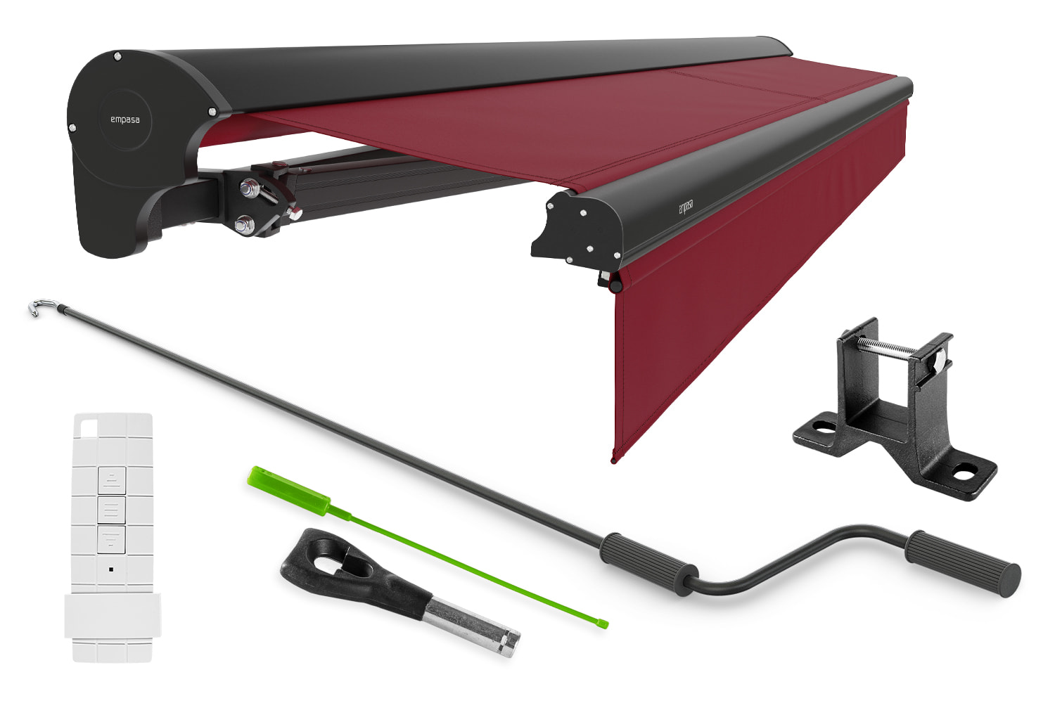 Die elektrische Halbkassettenmarkise schützt das Markisentuch von drei Seiten vor Regen und Schmutz. Das Tuch, welches in verschiedenen Farben zur Verfügung steht, kann dank Fernbedienung ganz einfach per Knopfdruck ein- und ausgefahren werden. Der Volant auf der vorderen Tuchseite bietet zusätzlichen Sonnenschutz bei tieferstehender Sonne und kann manuell per Handkurbel betätigt werden. Montiert wird die Markise standardgemäß an der Wand mithilfe der mitgelieferten Wandhalterung.