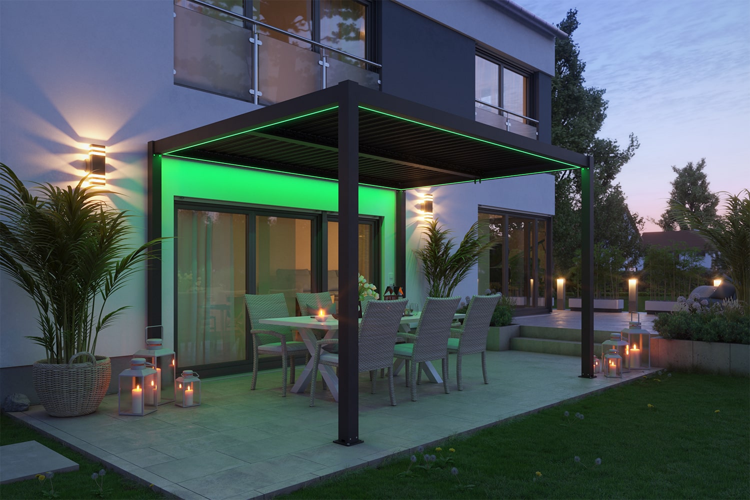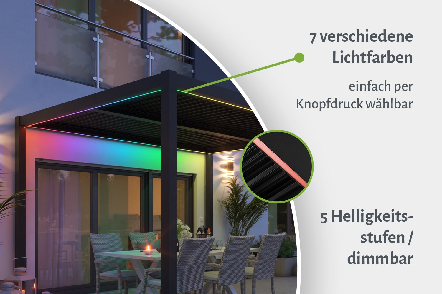 Verwandle mit Hilfe des LED-Lichtersets deine Pergola und Garten in einen magischen Ort. Die LED-Beleuchtung kann per Fernbedienung gesteuert und gedimmt werden und erstrahlt in sechs verschiedenen Farben sowie klassischem Weiß. So schaffst Du die perfekte Atmosphäre für jeden Anlass und machst deine Pergola zum Highlight des Gartens.