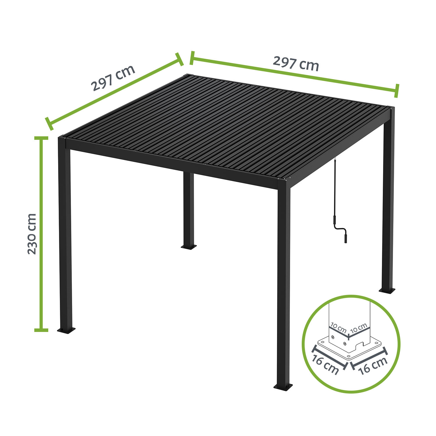 Die freistehende Pergola überzeugt mit einem verstellbaren Lamellendach aus stabilem Stahl. Die Handkurbel sorgt im Handumdrehen für den gewünschten Mix aus Schatten, Sonne und frischer Luft. Das robuste, rostfreie Material ist pflegeleicht und sorgt für eine lange Haltbarkeit.