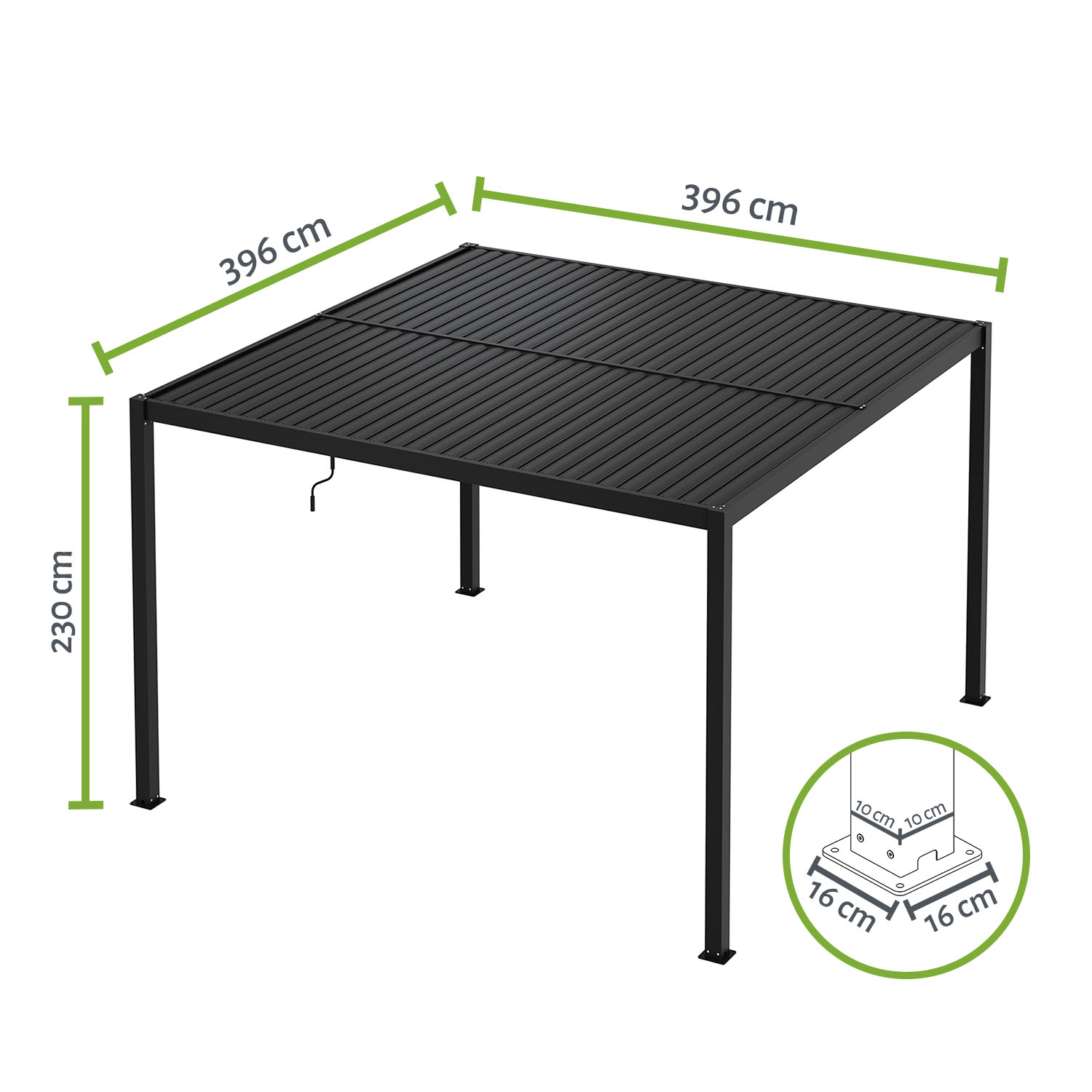 Die freistehende Pergola überzeugt mit einem zweifach verstellbaren Lamellendach aus pulverbeschichtetem Aluminium. Die Handkurbeln sorgen im Handumdrehen für den gewünschten Mix aus Schatten, Sonne und frischer Luft. Das robuste, rostfreie Material ist pflegeleicht und sorgt für eine lange Haltbarkeit.
