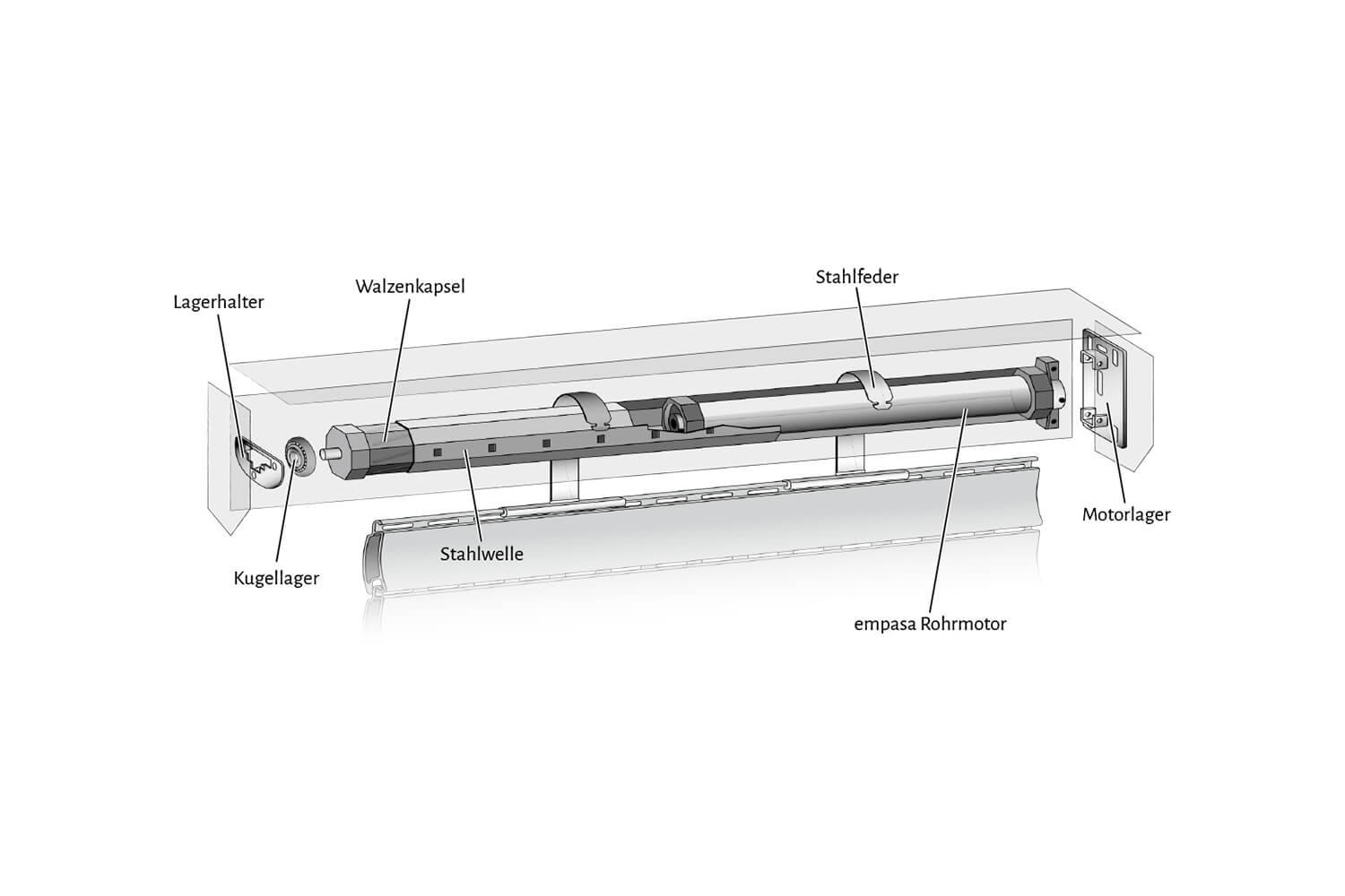 Der Rohrmotor überträgt seine Leistung direkt auf die Rollladenwelle und sorgt dadurch für die Bewegung des Rollladens. Der elektrische Antrieb erfolgt über das Einschieben des Rohrmotors in die Welle. Die Endlagen bringen den Rollladen zum Anhalten und können nach Belieben eingestellt werden. Das Hochziehen und Herunterlassen der Rollläden erfolgt dank des Motors entweder per Knopfdruck oder bei Verwendung einer Zeitschaltuhr zu einer bestimmten Zeit automatisch.