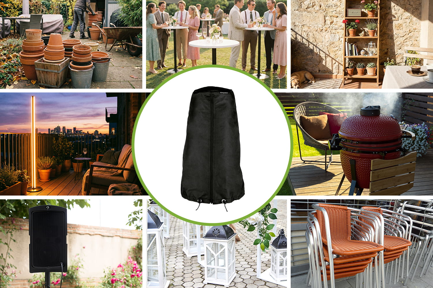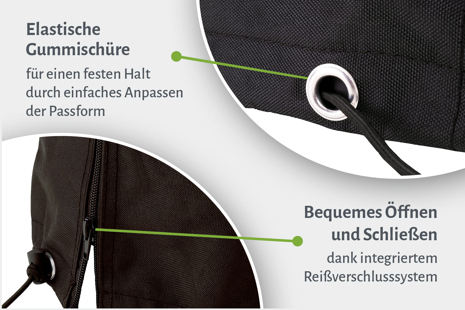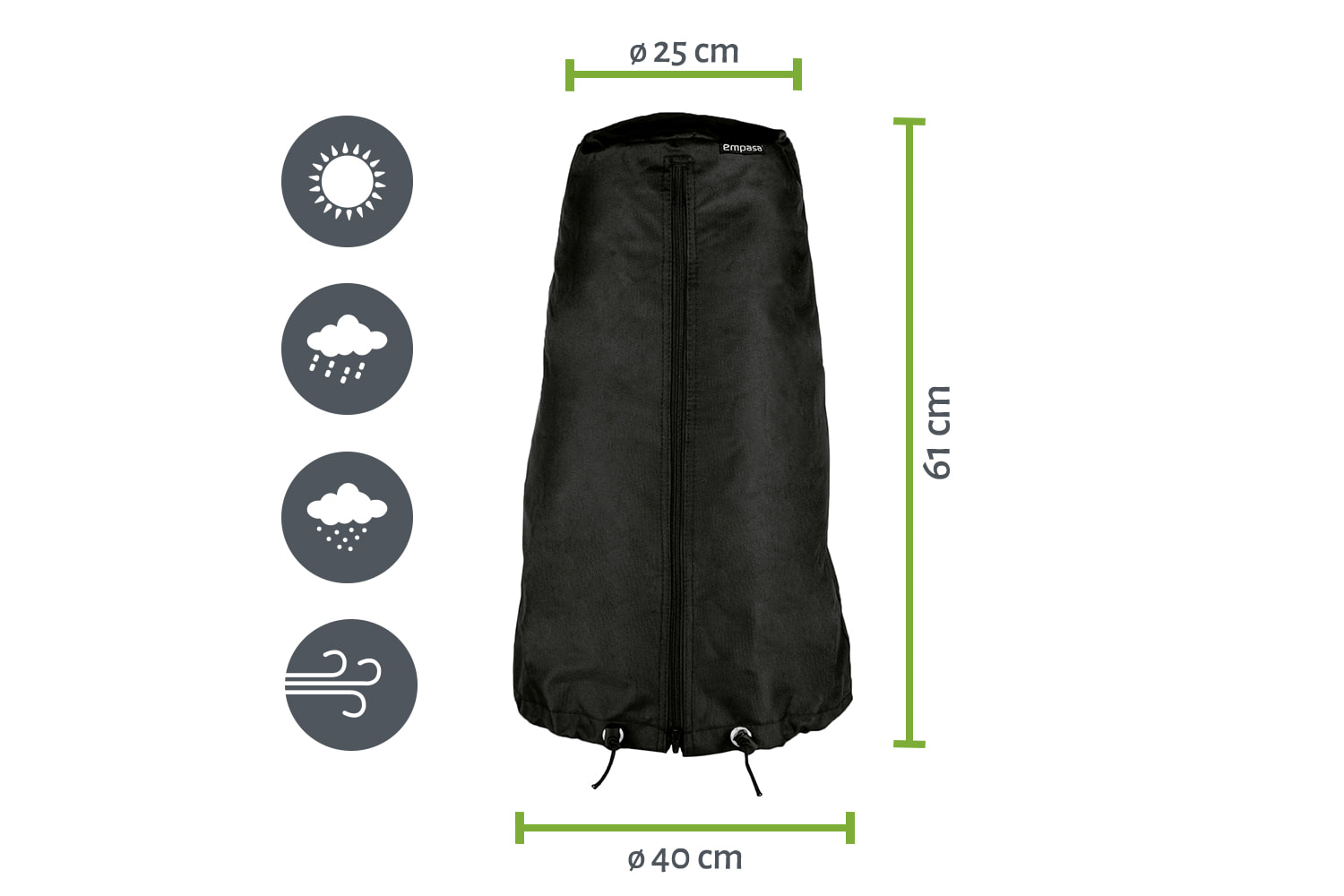 Die Schutzhüllen aus wasserabweisendem Polyester bieten sicheren Schutz vor Wind, Regen und Schmutz. Ob als Abdeckung für Gartenmöbel, deinen Grill, Sonnenschirm oder Terrassenheizer - die Hauben in zahlreichen Größen sind individuell nach eigenen Belieben einsetzbar. Die integrierten Reißverschlüsse und Gummischnüre ermöglichen eine besonders unkomplizierte Handhabung und einen sicheren Halt der Schutzhüllen.