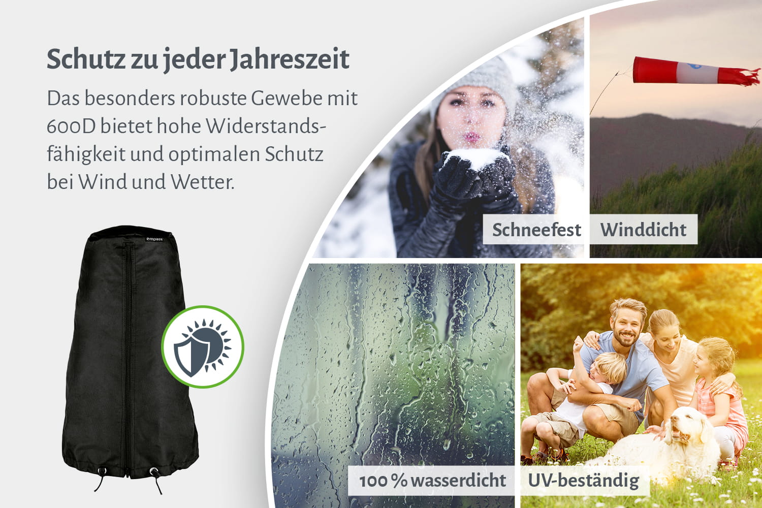 - Strapazierfähiger, witterungsbeständiger Stoff für jede Jahreszeit