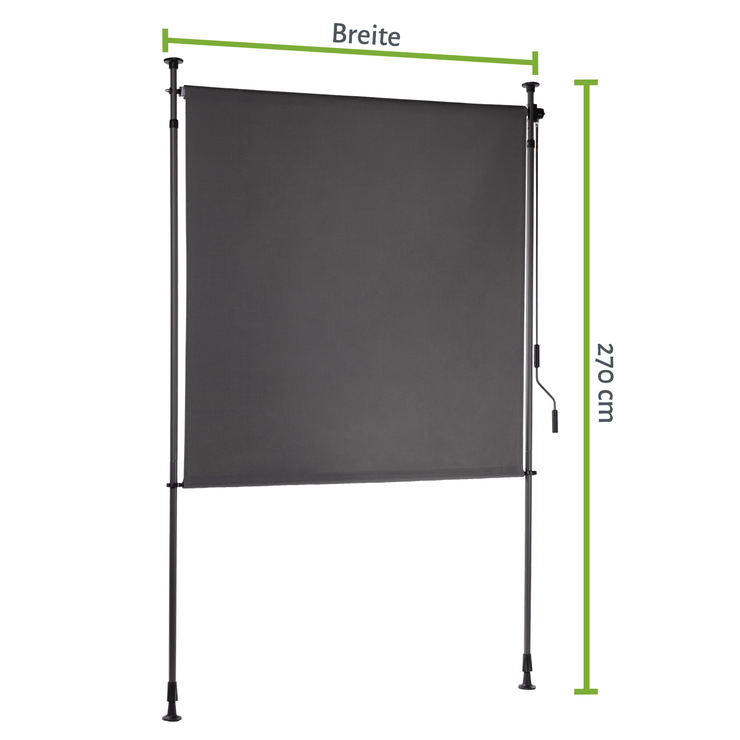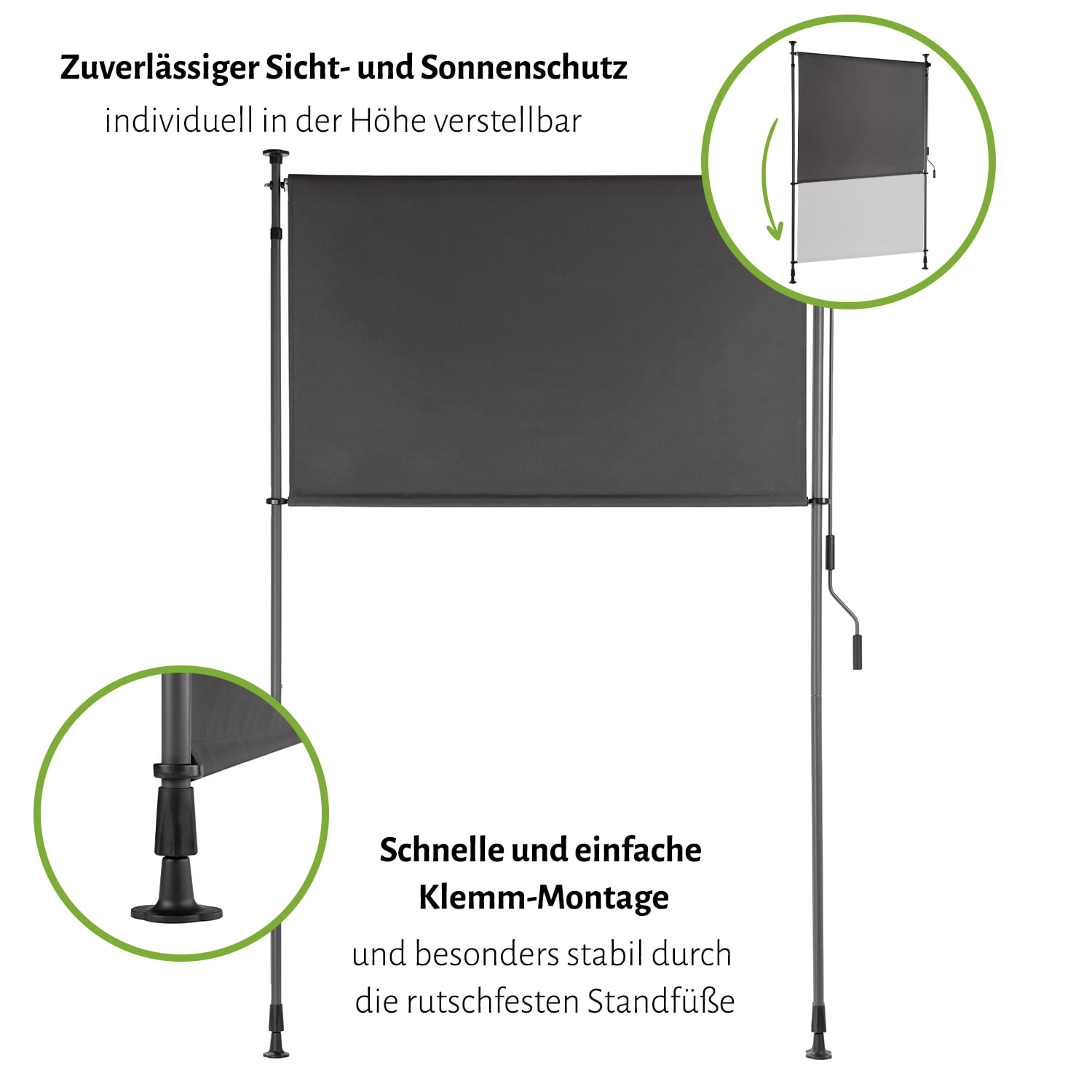 Die mühelose Montage der Seiten-Klemmmarkise erfolgt ohne Bohren, indem sie schlicht und einfach an deinem Wunschaufstellort zwischen Boden und Decke fixiert wird. Durch den PU-beschichteten Stoff ist die Markise sowohl UV-beständig als auch wasserabweisend. Die Markise bietet dir also zu jederzeit Schutz vor Sonne, Wind und neugierigen Blicken. So verpasst du deinem Außenbereich im Handumdrehen den letzten Feinschliff – ein Ruheort für deinen Feierabend.