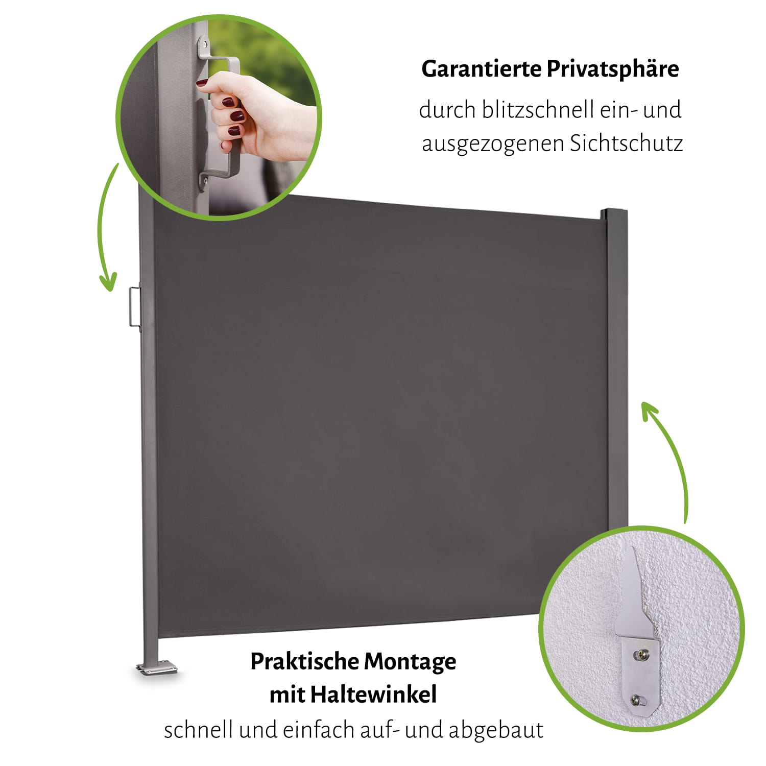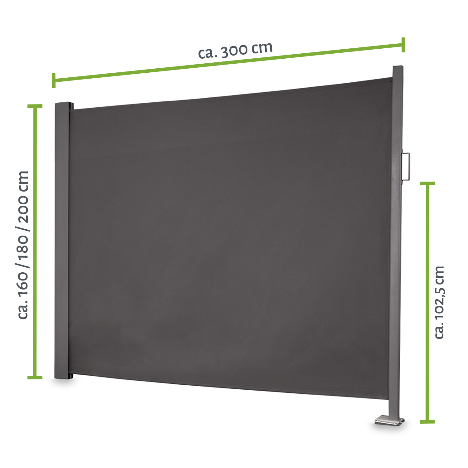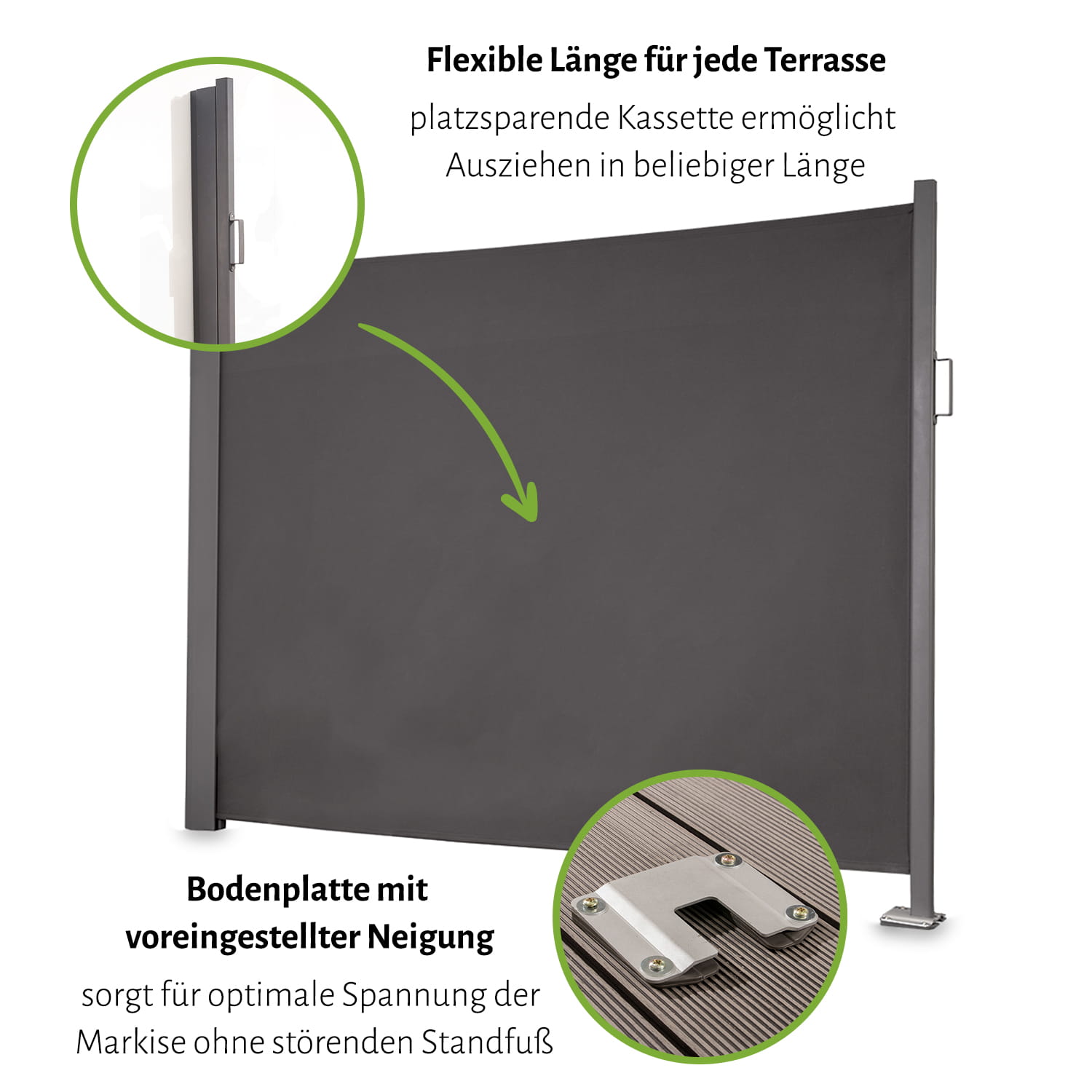 Die Seitenmarkise ist einfach montiert, denn dank der mitgelieferten Bodenplatte kann die Seitenmarkise auf fast allen Untergründen arretiert werden - dazu einfach die Bodenplatte an der gewünschten Stelle montieren - fertig. Leichte Gefälle an Terrassen oder Balkonen von ca. 1,5 cm können dank des integrierten Neigungswinkelausgleichs ausgeglichen werden. Je nach Größe verdeckt das Gewebe im ausgezogenen Zustand eine Fläche von ca. 150, 170, 190 cm Höhe x 280 cm Länge.