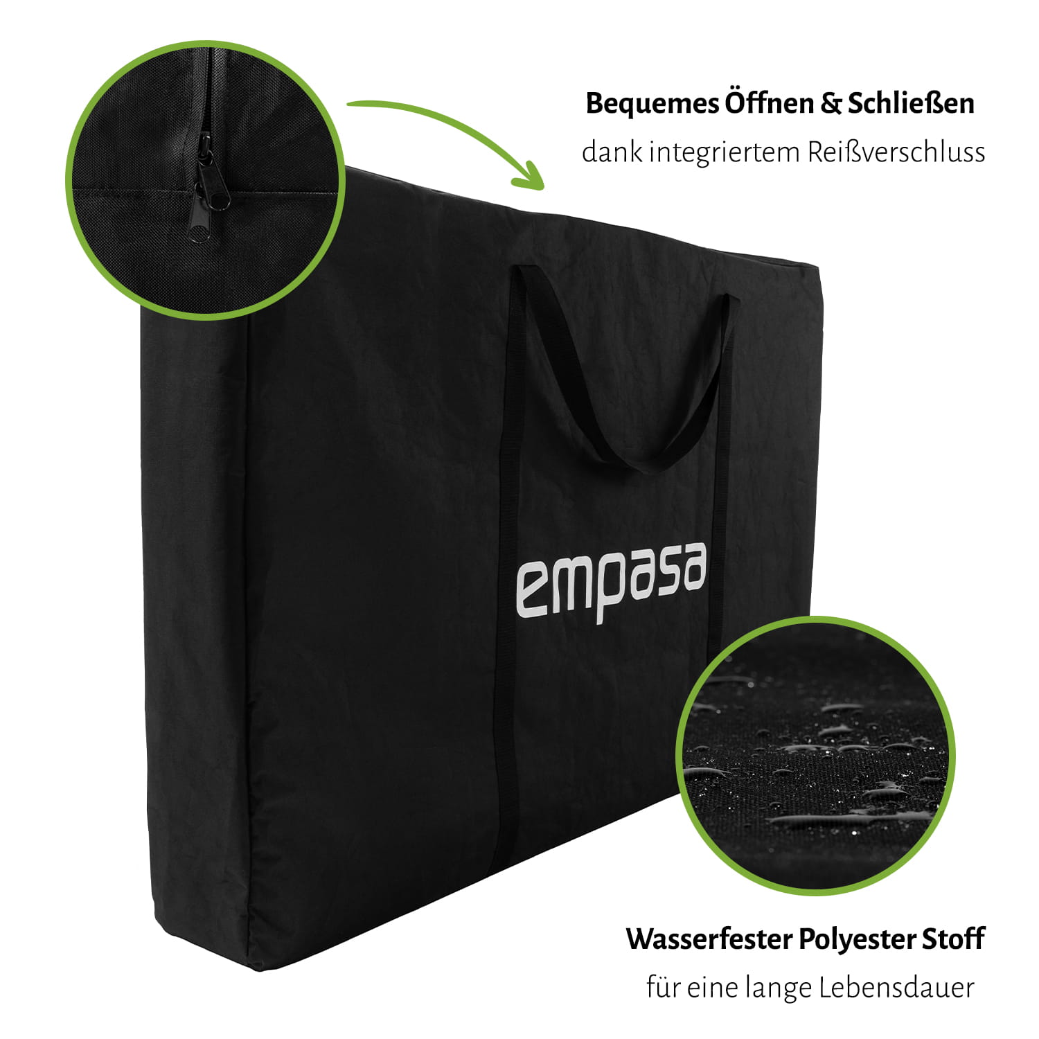 Die praktische Tasche ist ideal für den Transport des Polsters geeignet, genauso wie zum sicheren Verstauen. So ist deine Hängematte zuverlässig vor Staub, Schmutz und Sonneneinstrahlung geschützt, welches sich positiv auf die Lebensdauer deiner MAHALO auswirkt. Die praktischen Tragegriffe und der Reißverschluss ermöglichen eine komfortable Handhabung, während der wasserfeste Stoff für eine hochwertige Optik sorgt.