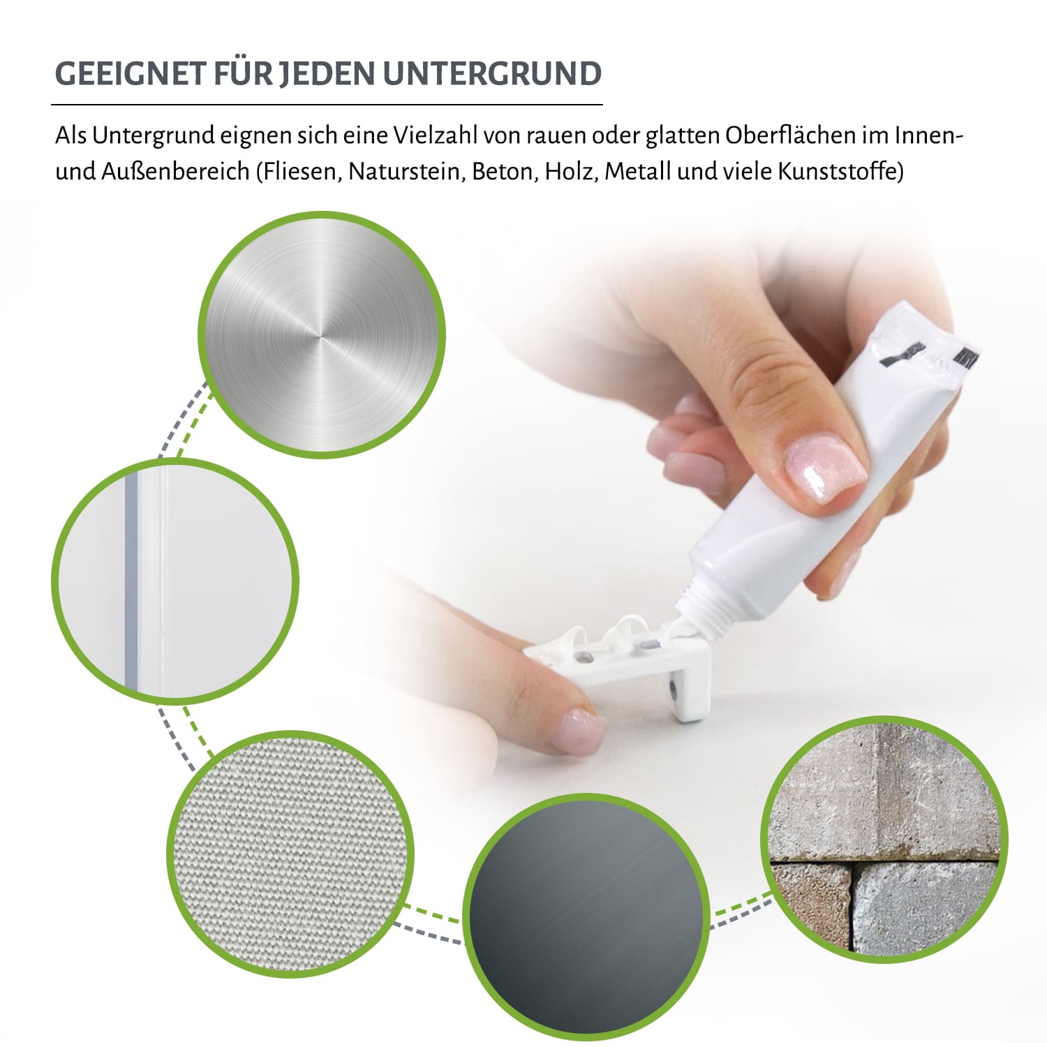 Geeignet ist der Alleskleber für glatte, aber auch raue Flächen, beispielsweise Fliesen, Naturstein, Holz, Beton, Metall und viele Kunststoffe. Untergründe, welche weniger tragfähig sind (beispielsweise Tapete oder Putz), können die Tragfähigkeit entsprechend beeinträchtigen.