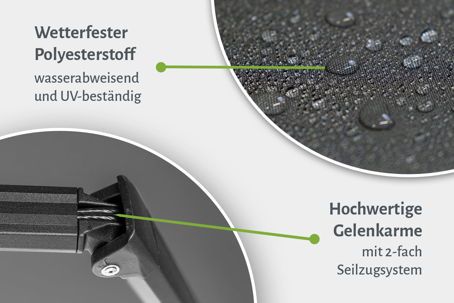 Die Markise sollte bei andauerndem Regen eingefahren werden, um die Lebensdauer des Stoffes zu verlängern.