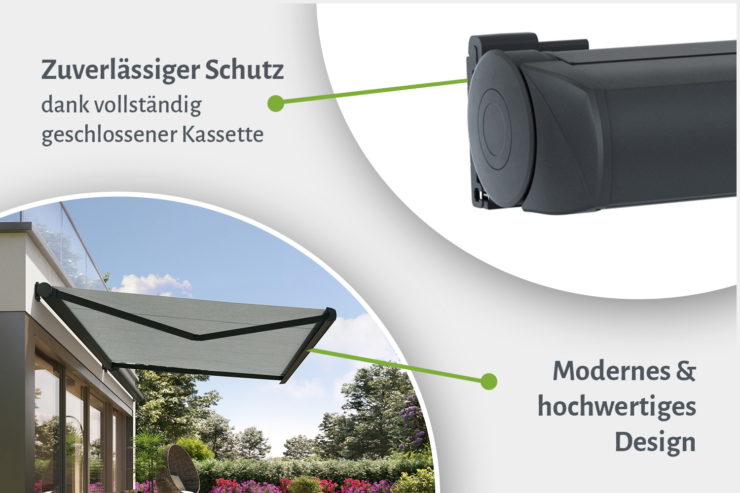 Die Kassette umschließt das Markisentuch im geschlossenen Zustand vollständig ohne jegliche Freiräume, sodass es perfekt vor Witterung und Schmutz geschützt ist. Diese effiziente Bauart macht die Markise besonders langlebig und pflegeleicht.