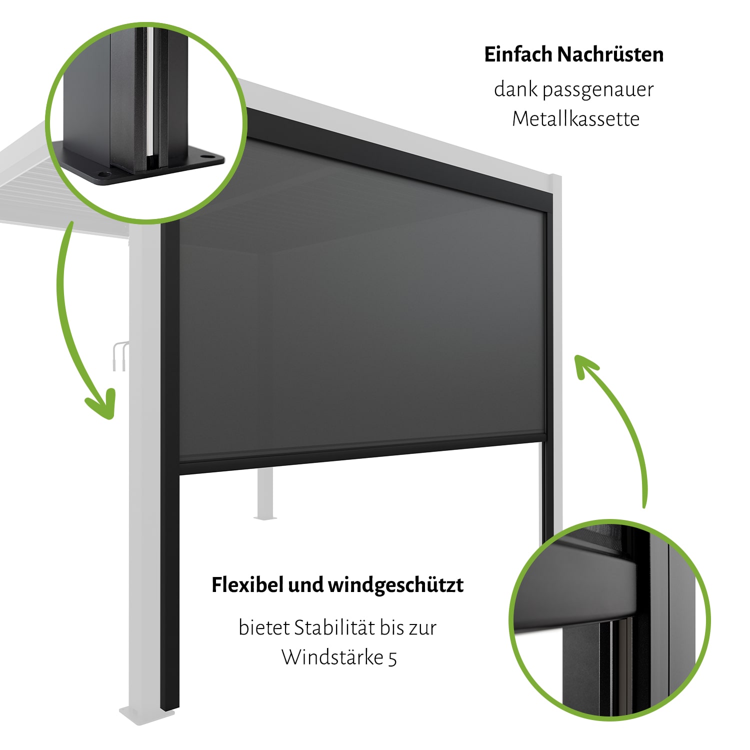 Das Rollo für unsere Pergola ZEUS ist ein wahrer Allrounder – als zusätzlicher Sonnenschutz bei tiefstehender Sonne oder erweiterter Sichtschutz. Unerwünschte Blicke der Nachbarn sind somit kein Problem mehr. Der Zubehör Artikel ist passend für unsere Pergola konzipiert und daher perfekt als Update geeignet. Das Ein- und Ausfahren des Sonnenschutzrollos erfolgt per Hand oder ganz bequem mit elektrischer Funkfernbedienung. Die Anbringung erfolgt nach Bedarf an jeder beliebigen Seite der Pergola.