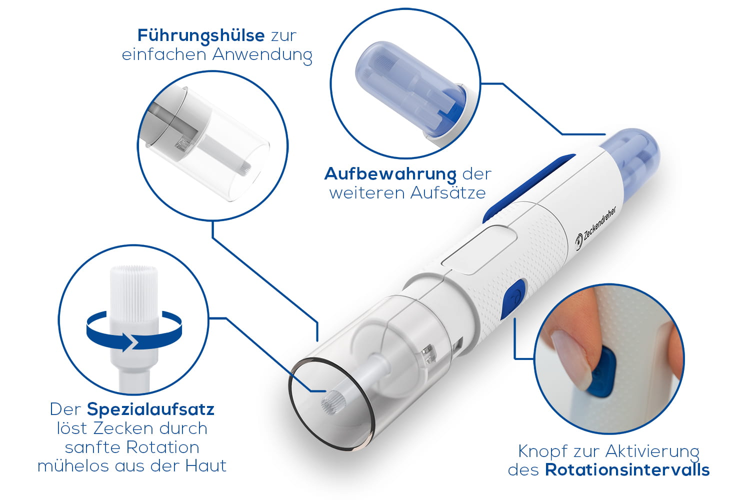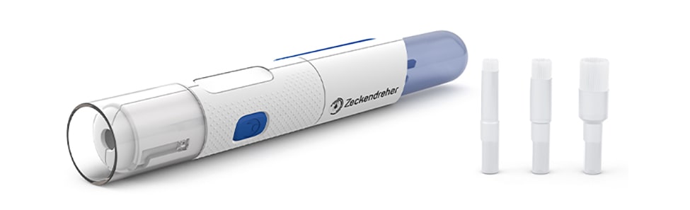 Im Idealfall löst sich die Zecke freiwillig aus der Haut hier kommt unser Zeckendreher ins Spiel. Unser Produkt entfernt die Zecke innerhalb weniger Sekunden ohne mechanische Einwirkung. Die Hülse sorgt für den optimalen, konstanten Abstand zur Zecke, sodass diese nicht gequetscht wird. Mit dem rotierenden Spezialaufsatz werden selbst kleinste Larven und Nymphen lebendig und unversehrt aus der Haut gelöst ohne Rückstände zu hinterlassen.